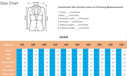 • 48R-Blazer:Shoulder=21.7''/55cm,Chest=52.4''/133cm,Belly=49.2''/125cm,Armhole=18.1''/46cm,Sleeve Length=26.8''/68cm,Blazer Length=31.5''/80cm.