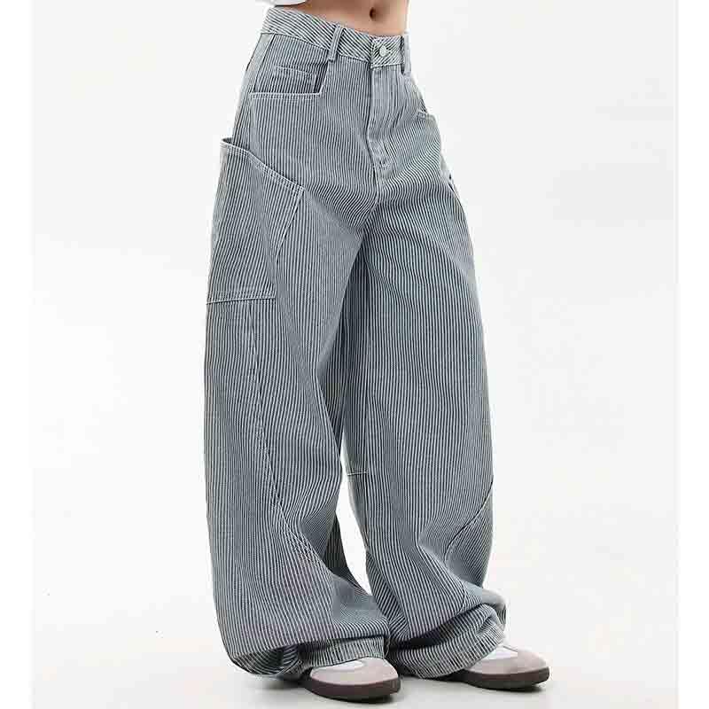 HOT ! BXCNCKD Women's Retro Striped Jeans with Loose Wide Legs and Large Pockets Cargo Pants Y2K Curved Banana Jeans