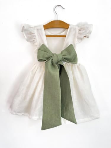HOT ! MyLittleDani White linen dress for a little flower girl, crafted from eco-friendly materials, with an elegant bow that can be customized in color. Boho Sage Green Wedding, Vintage Baby Dress