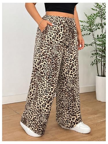 • Features: Plus size, leopard print, wide leg, drawstring, knot detail, pockets, high waist, loose fit, long length, casual style.