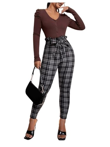 WDIRARA Women's Plaid Paperbag Waist Tie Front Stretch Belted Skinny Pants 4