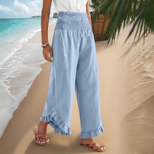 HOT ! Wide Leg Pants Woman,High Waisted Flowy Pants for Women Ruffle Hem Cropped Elastic Waist Beach Office Boho Trousers