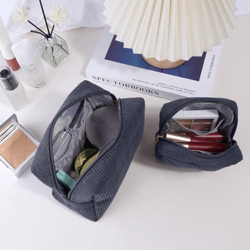 MAGEFY Makeup Bag for Purse, 2 Pcs Corduroy Cosmetic Bag for Girls Women Small Travel Makeup Pouch with Zipper (Grey) 2