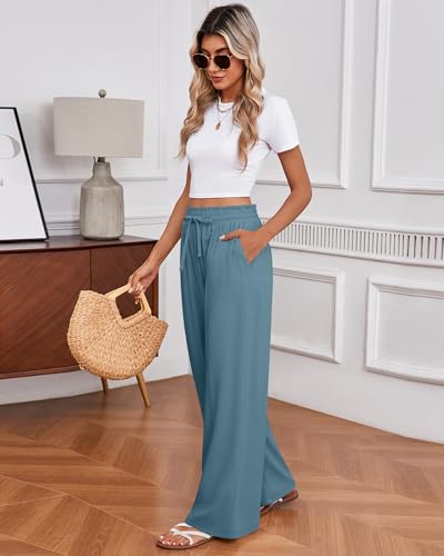 HOT ! Huukeay Women's Linen Wide Leg Pants, High Waist Flowy Palazzo Pants with Pockets Drawstring Summer Casual Work Trousers(Lake Blue,Large)