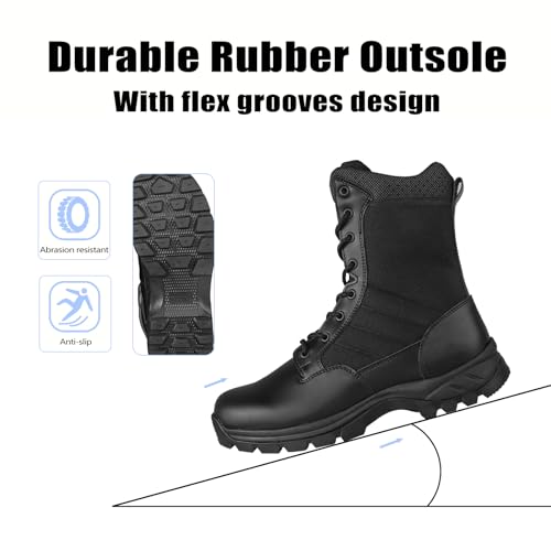 • Convenient fit:The mens combat boots are designed with an gusseted tongue and side zipper. The gusseted tongue can effectively prevent dust, mud and other debris from entering the shoes, keeping your feet clean and comfortable.The convenience of the side zipper makes putting on and taking off faster and more convenient, saving your precious time and energy.