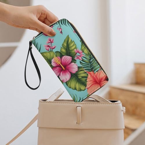 Hawaiian Tropical Leaves FlowersPrint Long Wallets PU Leather Clutch Purse Card Holder Wallet, with Wristlet Zip Around Long Wallet for Women & Men 7