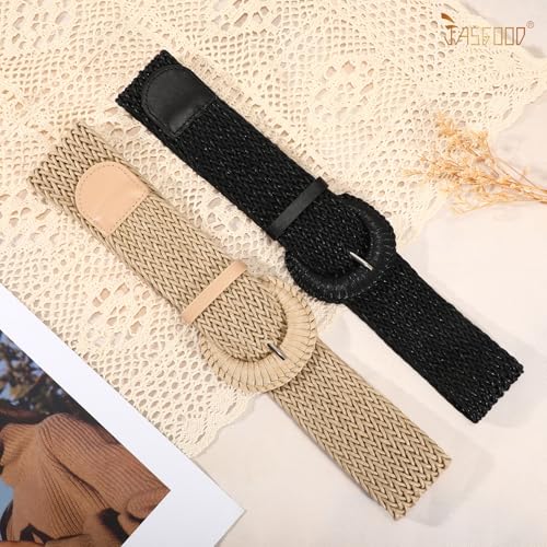 JASGOOD 2 Pack Women Woven Waist Belt for Dress Boho Rattan Belt Wide Braided Belt with Round Buckle 2