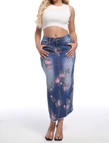 ebossy Women's High Waist Floral Printed Back Slit Frayed Hem Mid Long Bodycon Denim Skirt 1