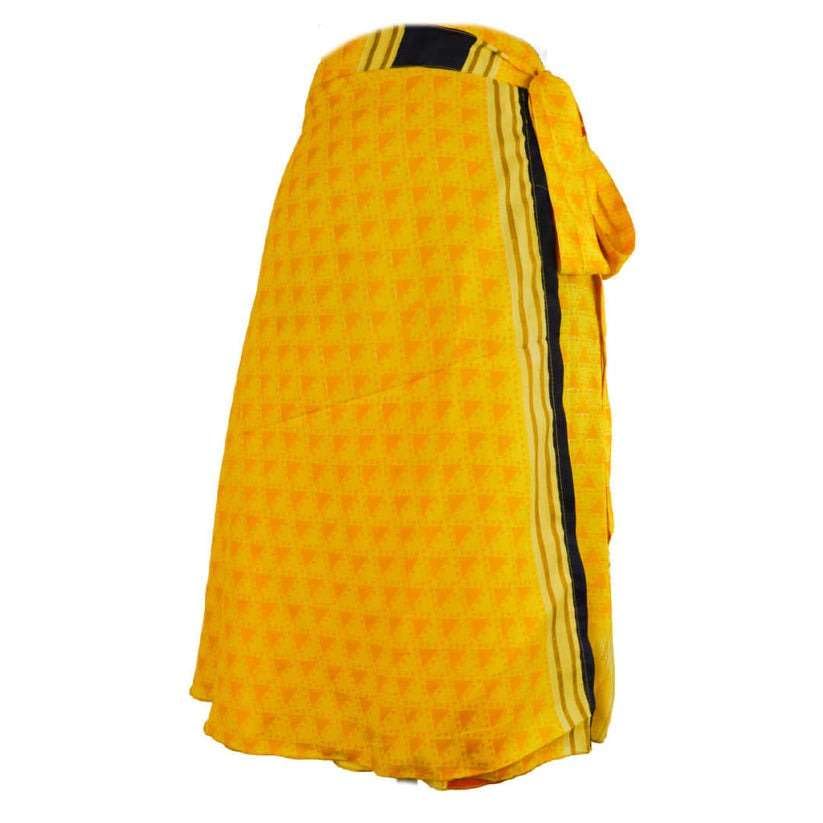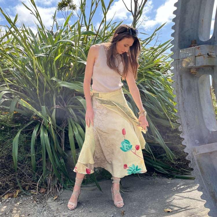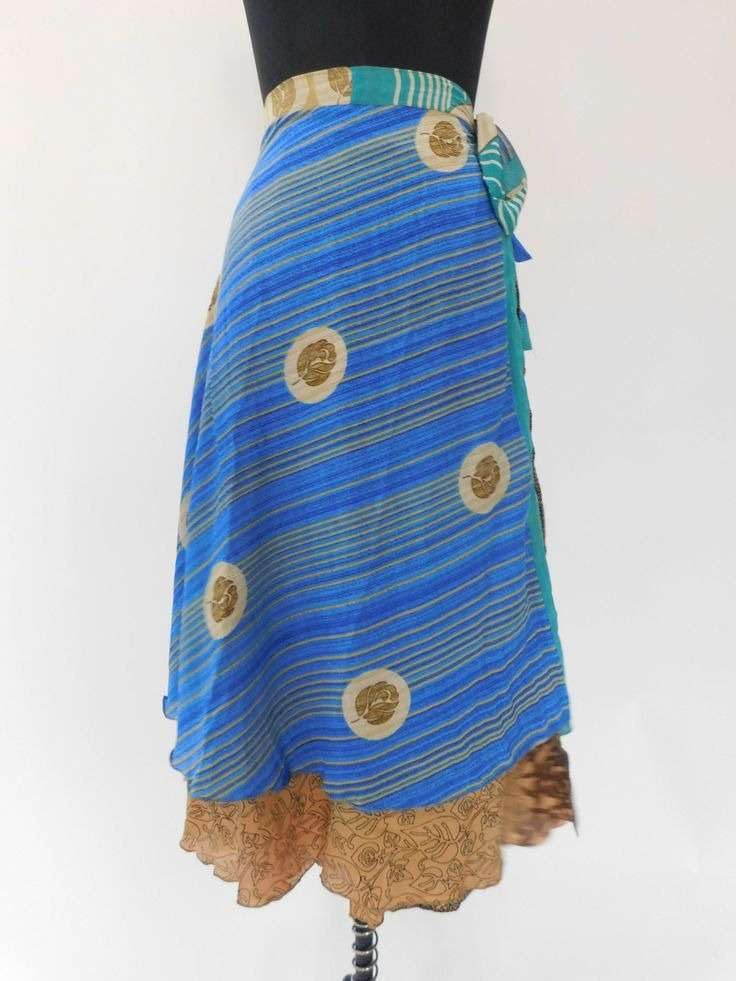 • Boho Silk Sari Design: Beautiful vintage-inspired wraparound skirt made from luxurious, multicolored silk sari fabric.