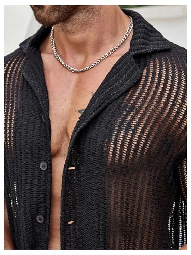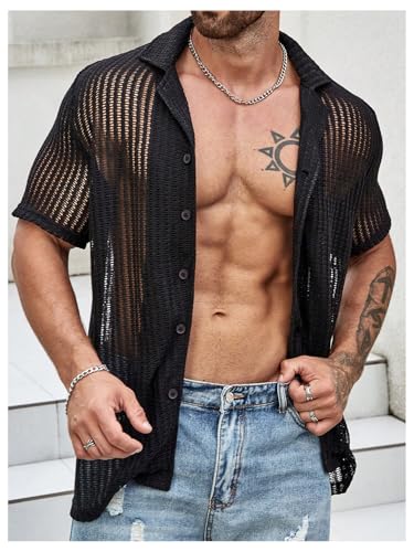 • Design: Mesh sheer, short sleeve, button front, hollow out, lapel collared, see-through shirt top, summer beach shirts, party shirts top for men