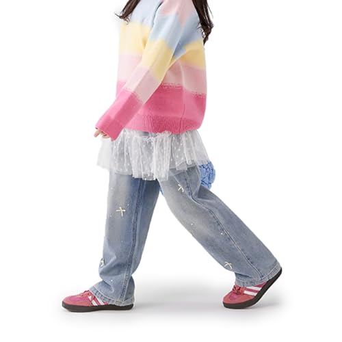 Baggy Jeans for Girls Rhinestone Bows Wide Leg Pants Adjustable Waist Pockets Cute Jeans for Girls Teen Kids Washed 7