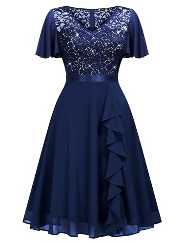 Miusol Women's Sequin Lace V Neck Ruffle Style Cocktail Party Chiffon A-line Dress 1