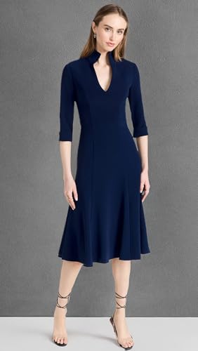 • Collared V neckline and elbow-length sleeves, Paneled seams
