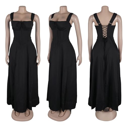 Generic Women Casual Corset Dress Sleeveless Lace Up Ruched Bodycon Split Tie Square Neck A Line Boho Flowy Maxi Sundress 1