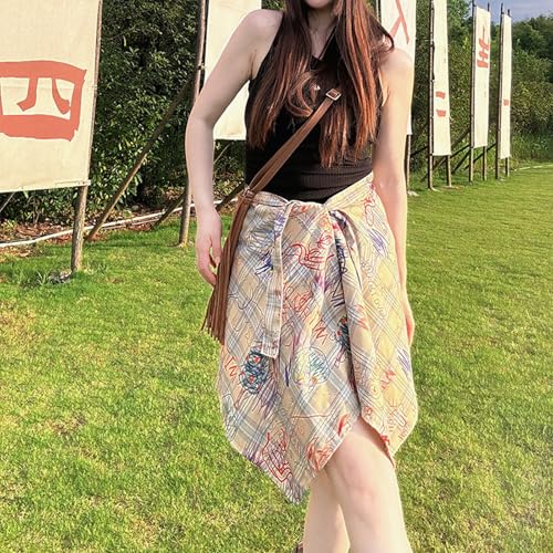 HOT ! Vintage Checkered Graffitis A Line Short Wrap Skirt for Women Layering Hip Covering Scarf Tie Up Asymmetrical Apron Skir