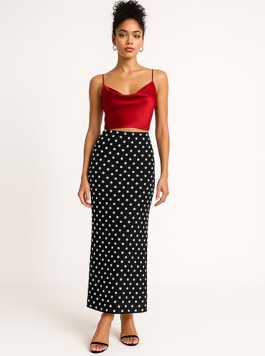 • Polka Dot Maxi Skirt: This womens polka dot maxi skirt features a classic black base with stylish white polka dots, designed in a high-waist cut that elongates the legs and adds retro-chic vibes