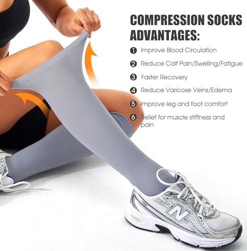 • LAB TESTED GRADIENT COMPRESSION -Our Graduated Compression Socks put pressure in just the right spots,work by creating a "pressure gradient"(using graduated compression of 15-20 mmHg)which helps to push oxygen-poor blood out of the feet and legs,and back to the heart. More blood pumping means more Healthier legs and less pain+swelling.Great for long periods of sitting or standing, endurance sports, flying and travel, post-workout recovery, pregnancy, and spider & varicose veins.