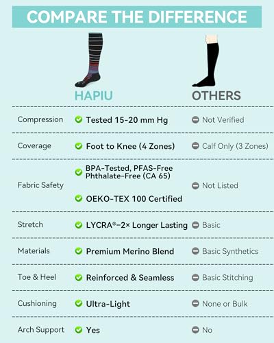 • ADVANCED 4-ZONE GRADUATED COMPRESSION: 15-20 mmHg tested compression socks offer targeted Arch-to-Knee support, boosting circulation and reducing swelling. Ideal for nurse, travel, long flight, pregnant women, prolonged standing & daily wear