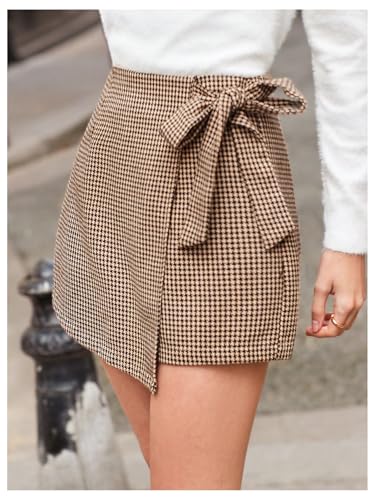 HOT ! Floerns Women's Houndstooth Print Tie Front Skorts Asymmetrical Hem High Waist Skirt Shorts