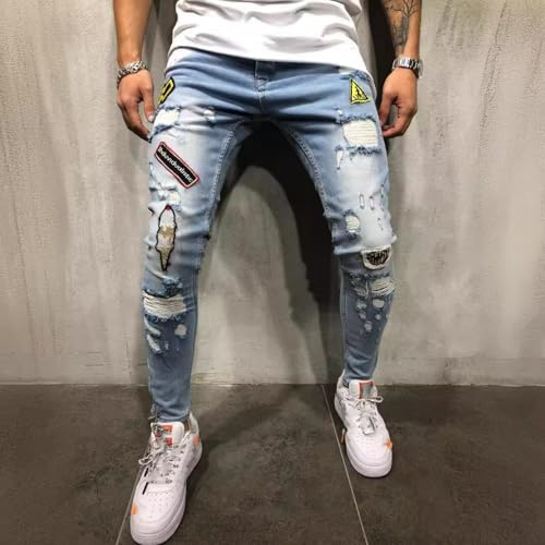 HOT ! Jeans Pants Trouser Denim Tight Piercing Street Trendy Badge Embroidered Micro Elastic Slimming Small Leg for Men