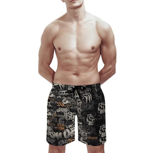 HOT ! Mens Vintage Graffiti Swim Trunks Swim Shorts Quick Dry Inseam Beach Shorts with Compression Liner and Pocket, Black