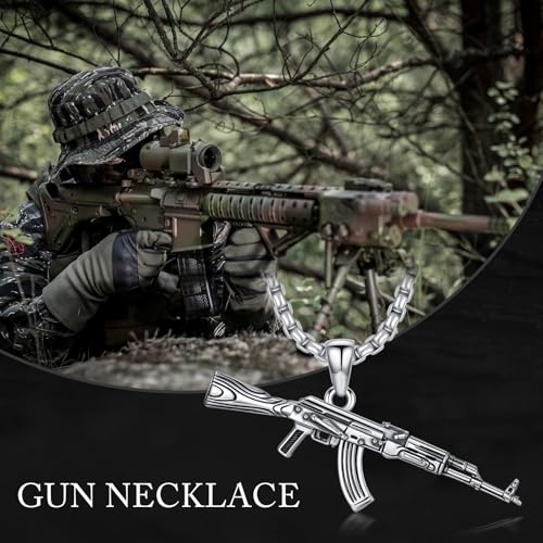 HOT ! Gun Necklace 925 Sterling Silver Hip Hop AK-47 Gun Pendant Necklace for Men, w/Stainless Steel Chain 22 + 2 Inch