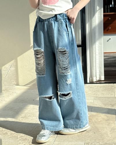 • Material: Wide leg ripped jeans girls are made of soft cotton denim with vintage wash. These Hole jeans for girls 10-12 offer superior comfort for active kids. The breathable fabric ensures year-round wearability