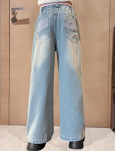 AUBIG Kids Girl's Casual Jeans High Elastic Waist Cool Ripped Jeans Straight Leg Distressed Denim Pants with Pocket 5