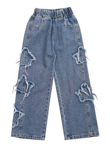 Aislor Girls Frayed Star Patch Straight Wide Leg Jeans Kids Elastic Waist Denim Pants Washed Denim Trousers with Pockets 6