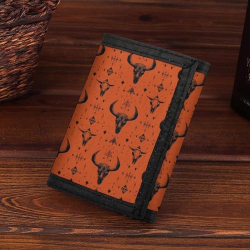 • Design: Featuring a versatile trifold design, this men's wallet includes a front zipper compartment for quick access to essentials. Inside, there are spaces dedicated for ID cards, cards, and changes. The inclusion of a keychain allows you to carry your keys effortlessly, making it a Orange Goat Skull A Print simple wallet for men that's all about practicality