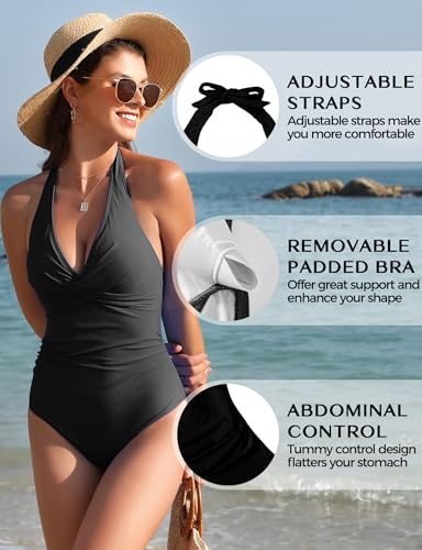 Buauty Women's One Piece Swimsuits Tummy Control Bathing Suits V Neck Ruched Push Up Halter Slimming Swimwear 1