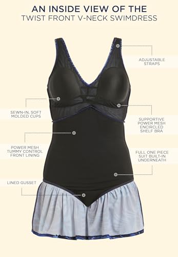 • Enhance your beachside look with this stylish swim dress that features a flattering V-neckline and twist-front detail. A full one-piece suit with power-mesh lining offers tummy control and hip minimizing support. Built-in power-mesh bra with sewn-in foam cups and adjustable straps. A-line silhouette.