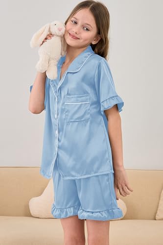 More information about Summer Satin Pajama 2 Pieces Ruffles Sleeve Shorts Loung Sets Button Down Sleepwear for Teen Girls with Pockets
