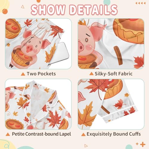 Satin Pajama Sets Short Sleeve Piggy with Autumn Leaves Button Down Silky Nightwear 2 Piece PJS 5-14Y 6