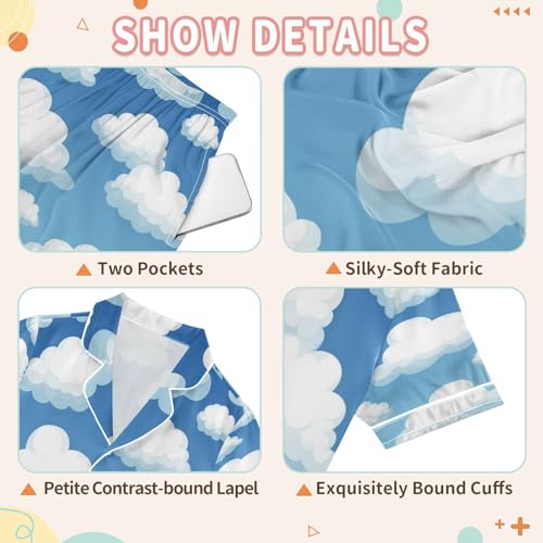 Satin Pajama Sets Short Sleeve White Clouds Button Down Silky Nightwear 2 Piece PJS 5-14Y 1