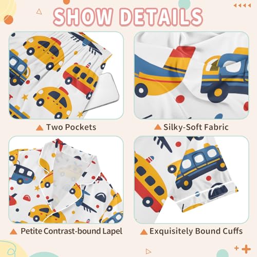 Satin Pajama Sets Short Sleeve Transportation Vehicles on Colorful Button Down Silky Nightwear 2 Piece PJS 5-14Y 5