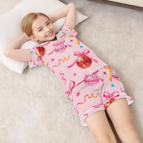 Satin Pajama Sets Short Sleeve Disco Balls with Ribbons Pattern Button Down Silky Nightwear 2 Piece PJS 5-14Y 1