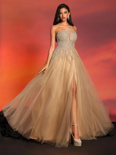 • Features: One shoulder, spaghetti strap, sequin, a-line, slit, lace up, long elegant dress.