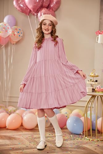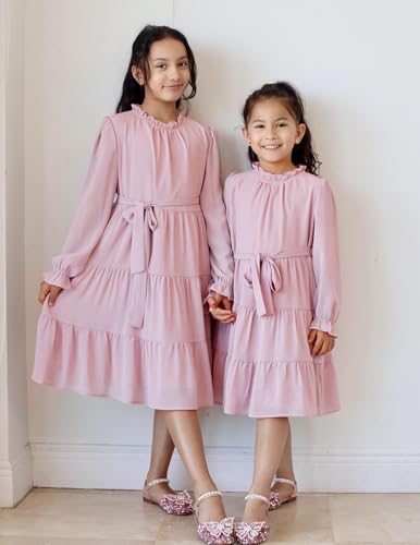 Arshiner Girls Long Sleeve Dress Tween Fall Formal Party Holiday Midi Tiered Flowy Swing Dresses with Belt 5-13 Y 1