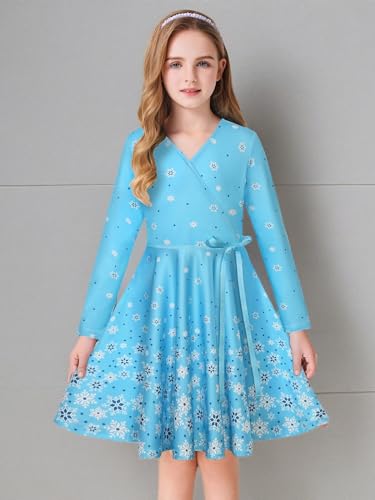 Girls' V Neck Dress Floral Printed A-line Swing Casual Party Dress with Belt for 6-14 Years 5