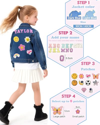 • Personalized Denim Jackets: Our personalized toddler jackets can be customized with your child's name and cute patterns on the back. We offer two colors, six sizes, and 107 adorable patch elements. Click the "Customize Now" button to customize your look. Names with more than five or six letters will automatically be arranged in an arc (up to eight characters are supported). Create a unique denim jacket for your child and make them stand out.