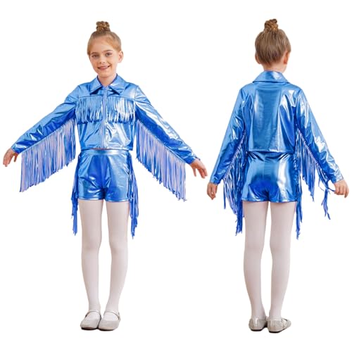 Kids Girls Fringe Shiny Metallic Long Sleeve Jacket Coat Sweatshirt Crop Tops Outerwear with Dance Shorts Set 5