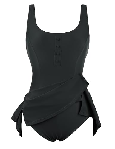• One-piece swimdress features a square neckline adorned with four non-adjustable decorative buttons, adding a touch of cute elegance to the swimsuit dress