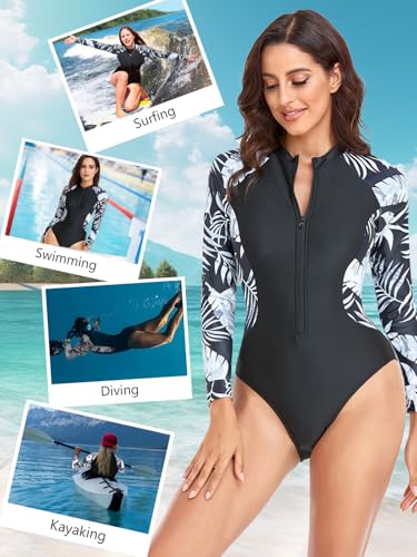 SHAPERIN Women's Long Sleeve Rash Guard UV UPF 50+ Sun Protection Zipper Printed Surfing One Piece Swimsuits Bathing Suit 1