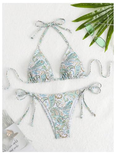HOT ! Verdusa Women's 2 Piece Paisley String Halter Bikini Set Self Tie High Cut Swimsuit