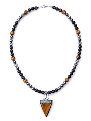 Jovivi Mens Stone Beaded Necklace Natural Tiger Eye Obsidian Hematite Healing Crystal Necklace Triangle Pendulum Pendant Crystal w/Moon 7