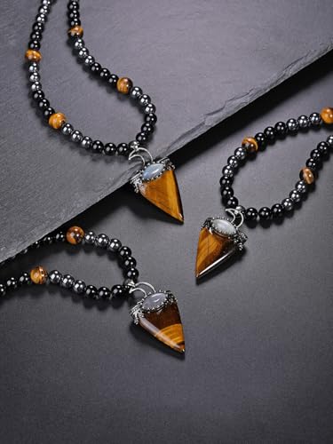 Jovivi Mens Stone Beaded Necklace Natural Tiger Eye Obsidian Hematite Healing Crystal Necklace Triangle Pendulum Pendant Crystal w/Moon 5