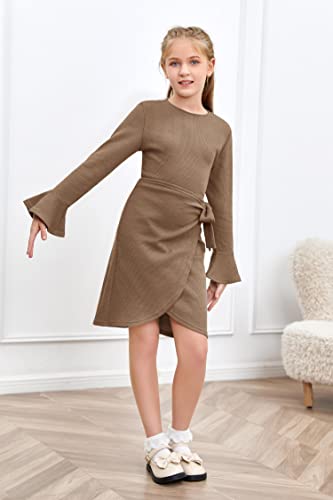 HOT ! Girl's Midi Dresses Solid Waffle Knit Dress Flared Long Sleeve Belted Dress for Kids
