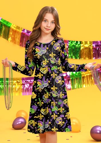 HOT ! Girl's Mardi Gras Fleur de Lis Print Long Sleeve Midi Dress Carnival Outfit 4-12 Years