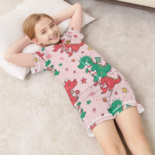 Satin Pajama Sets Short Sleeve Cute Dragons on Pink Button Down Silky Nightwear 2 Piece PJS 5-14Y 6
